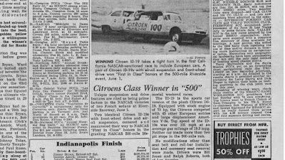 Najlepiej z wszyskich aut nieamerykańskich poradziły sobie Citroeny. Oba dojechaly do mety, a na dystansie 500 mil tankowaly tylko po dwa razy. Bill Jones dojechał na 18-stej pozycji, zaś Ralph Roberts na 19-stej. Francuskie limuzyny na torze Riverside osiągały 101 mil na godzinę (czyli 162 km/h). Jones został też zwycięzcą klasy. Niestety nie udało mi się znaleźć na czym polegał podział na klasy w ówczesnych wyścigach NASCAR.